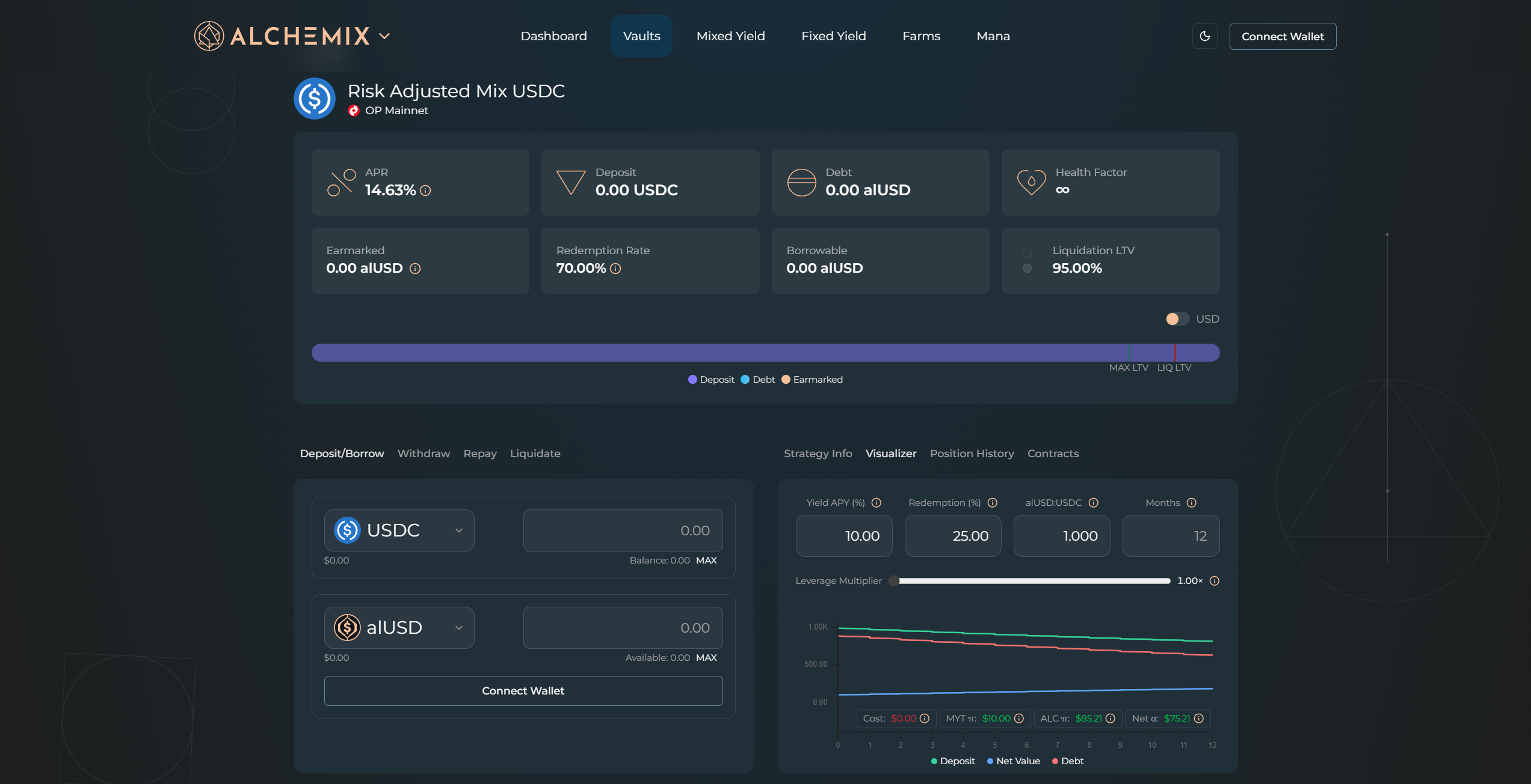 LTV meter – in the main context window, a colored bar shows your live and maximum loan-to-value. The hard cap (90%) or current cap is marked by a red line. To avoid liquidations, keep your LTV below the indicated liquidation level, the further the better.